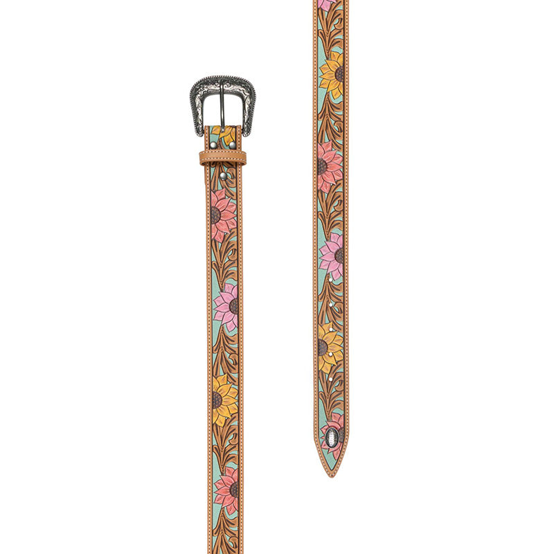 The Pure Western Carleen Adult Belt blends refined craftsmanship with elegant details. Featuring a tooled leather strap adorned with delicate painted flowers, this belt adds subtle artistry to your ensemble. Its removable buckle and antique silver Pure Western concho offer versatile styling options and a touch of vintage charm. Perfect for elevating both casual and dressy looks with understated sophistication.