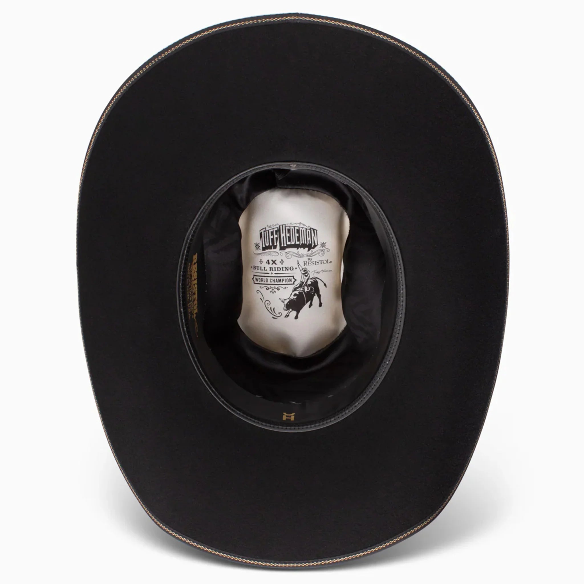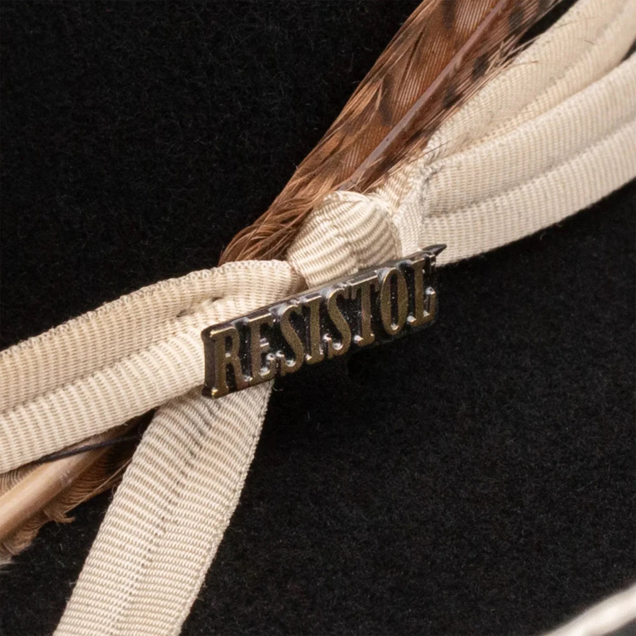 Fiery, confident, and fierce as all get-out, the 4X Snake Eyes B in Black brings some serious energy to the table. Part of Resistol’s Tuff Hedeman Collection, this 4X felt hat has a 4 1/4” brick crown, a 4 1/4" brim, and a leather sweatband. A bound edge, a contrasting fabric hatband adorned with a Resistol pendant, and a wild feather add extra swagger.