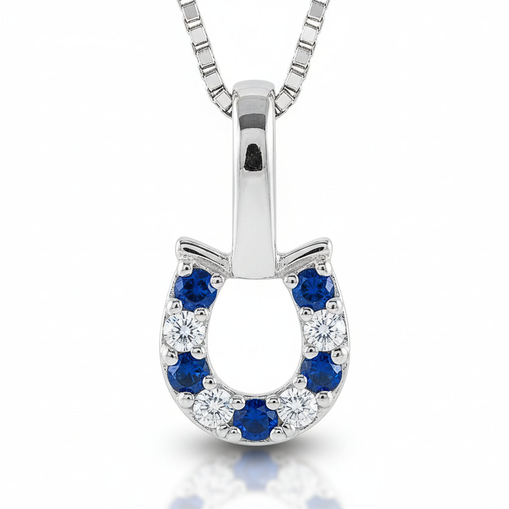 The Kelly Herd Blue & Clear Horseshoe Necklace features a delicate sterling silver enhanced with blue and clear CZ stones set in a horseshoe. Perfect for taking a little luck into the ring with you! Comes with 16-18" adjustable chain.