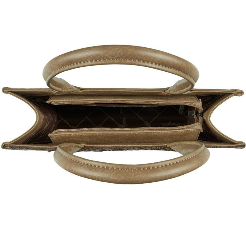 Elevate your style with the Wrangler Carly Bag, featuring a beautifully tooled leather cut-out design and the iconic Wrangler® logo for timeless appeal. Crafted from a blend of PU and genuine leather, it offers durability with a sophisticated edge. The top zip closure secures your belongings while the back feature pocket and internal zip and padded pockets provide organized storage. Fully lined and sized to perfection at 36cm (W) x 27cm (H) x 13cm (D), this bag combines form and function for everyday elegance.