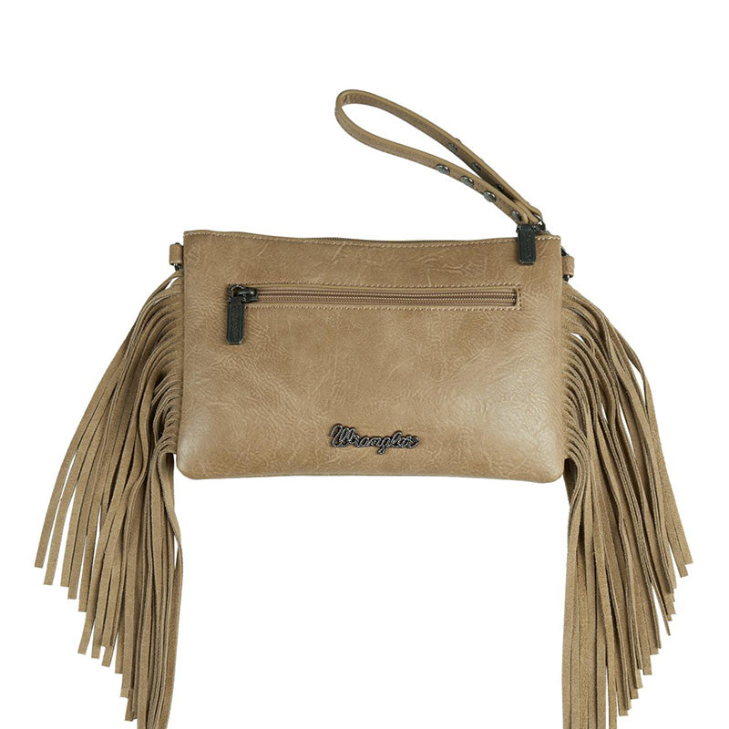 The Wrangler Louella Bag is a refined accessory featuring a tooled front panel and a sleek top zip closure. It offers practicality with multiple pockets, including a zipped back pocket and internal zip and card compartments. Suede side tassels enhance its elegant design, complemented by a removable and adjustable crossbody strap and a detachable wristlet for versatile wear. Fully lined and adorned with a subtle Wrangler metal badge, this bag blends sophistication with everyday functionality.