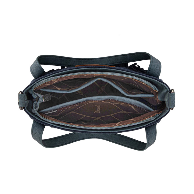 The Wrangler Two Tone Fringe Bag in navy combines classic Western style with contemporary elegance. Crafted with contrasting tones and finished with distinctive fringe detailing, this versatile bag transitions seamlessly from casual outings to refined occasions. The navy colorway offers timeless appeal that complements any wardrobe, while the thoughtful design ensures both aesthetic charm and practical functionality. An ideal accessory for those who appreciate authentic craftsmanship and understated sophistication.