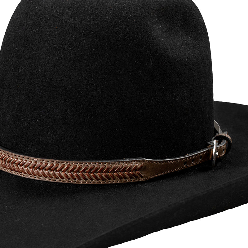 Brown leather hat band with buckle. Designed to fit most hats sizes.